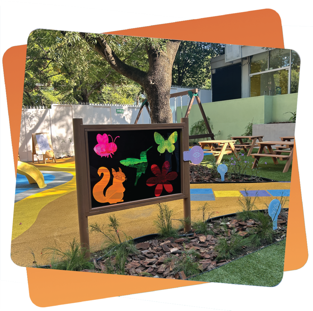 Los pequeños disfrutan de un hermoso jardín sensorial al aire libre. Los ambientes están adaptados a la medida de los niños más pequeños, con pizarrones y estanterías bajas y distintas medidas de mesas y sillas, para el goce de los pequeños.